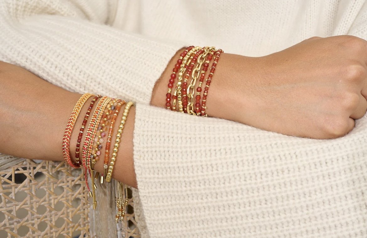 A new addition to our Friendship range, the Valina Gold and Red Agate bracelet brings a fiery twist to everyday elegance.This delicate gold chain bracelet adds a burst of energy to your wrist stack, with its warm red gemstone beads and shimmering gold accents.