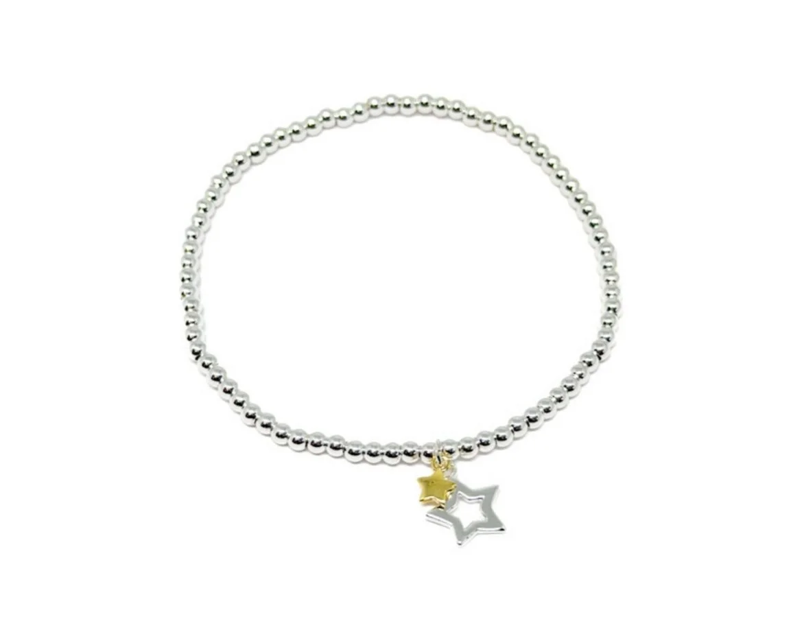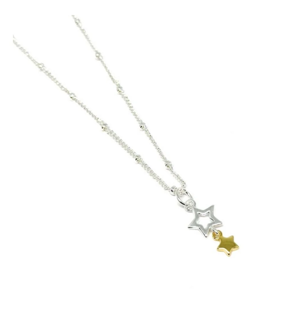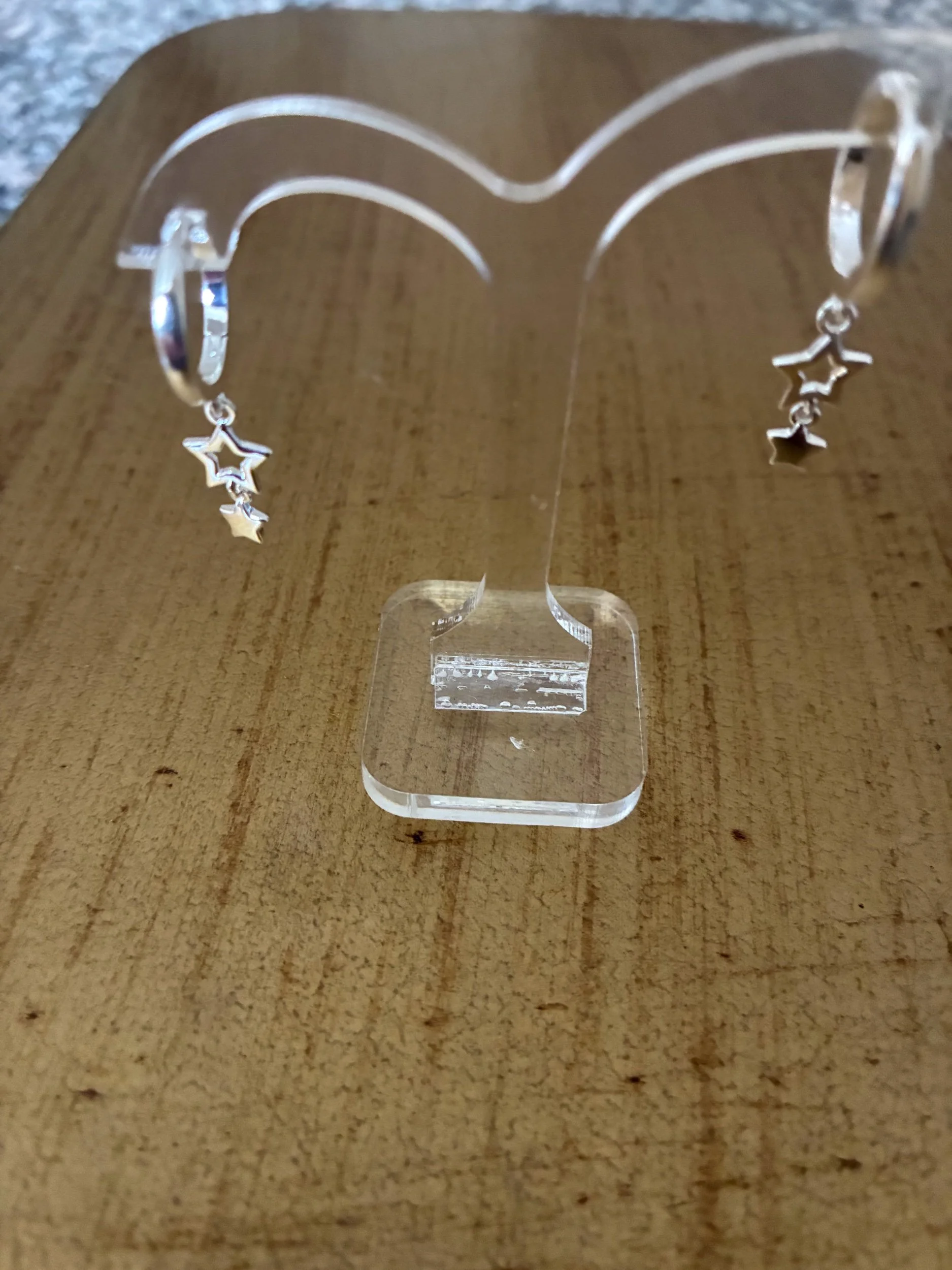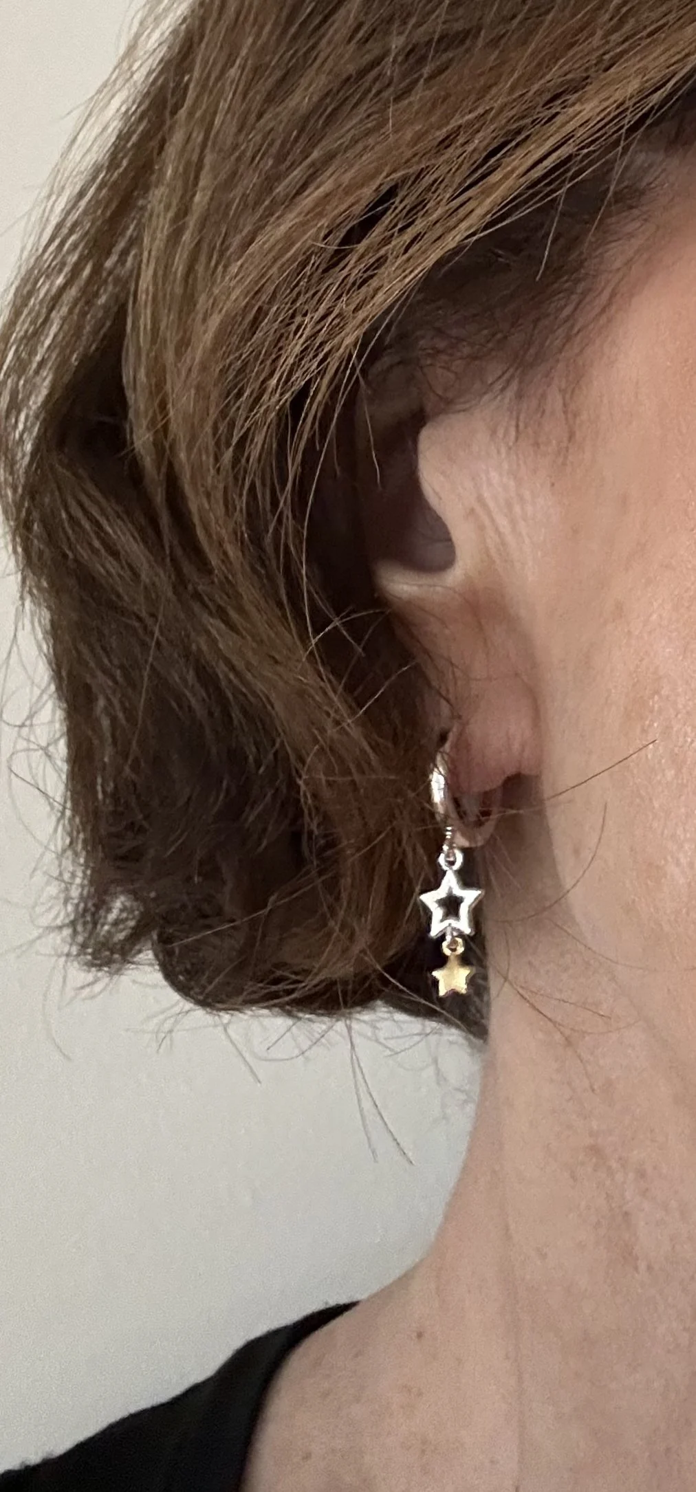 Reach for the stars with these eye catching huggie hoop earrings Adorned with a silver open star charm with a silver or gold mini star drop beneath it.Wear on their own or as part of your ear stack.Matching Juno Star Necklace and bracelet available.