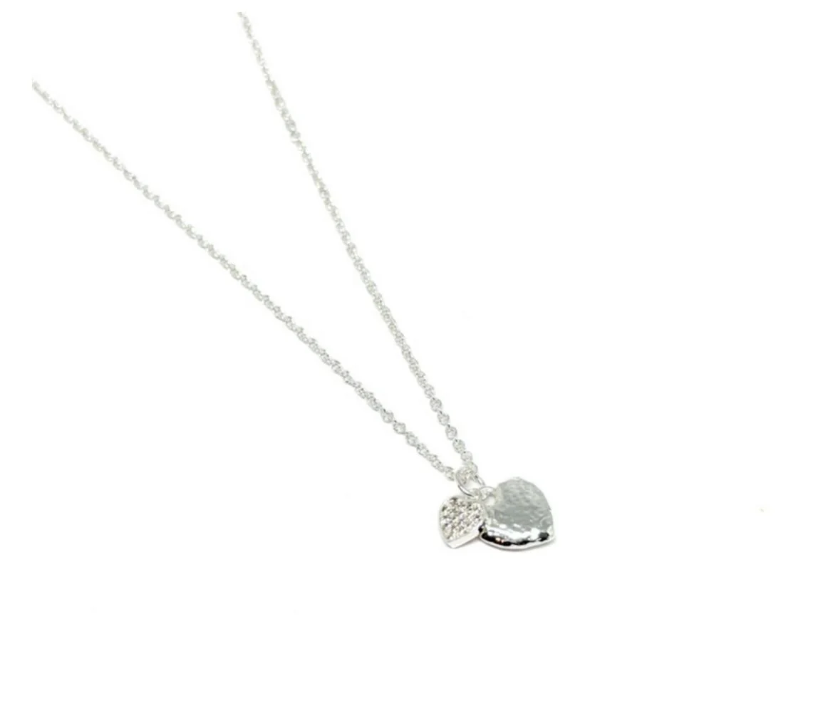 An attractive gold or silver hammered heart with accent sparkle heart charm on a silver plated chain .The ideal ,easy to wear necklace.Wear on its own for a minimalist vibe , or with other necklaces in our range for a layered look.Matching bracelet available.