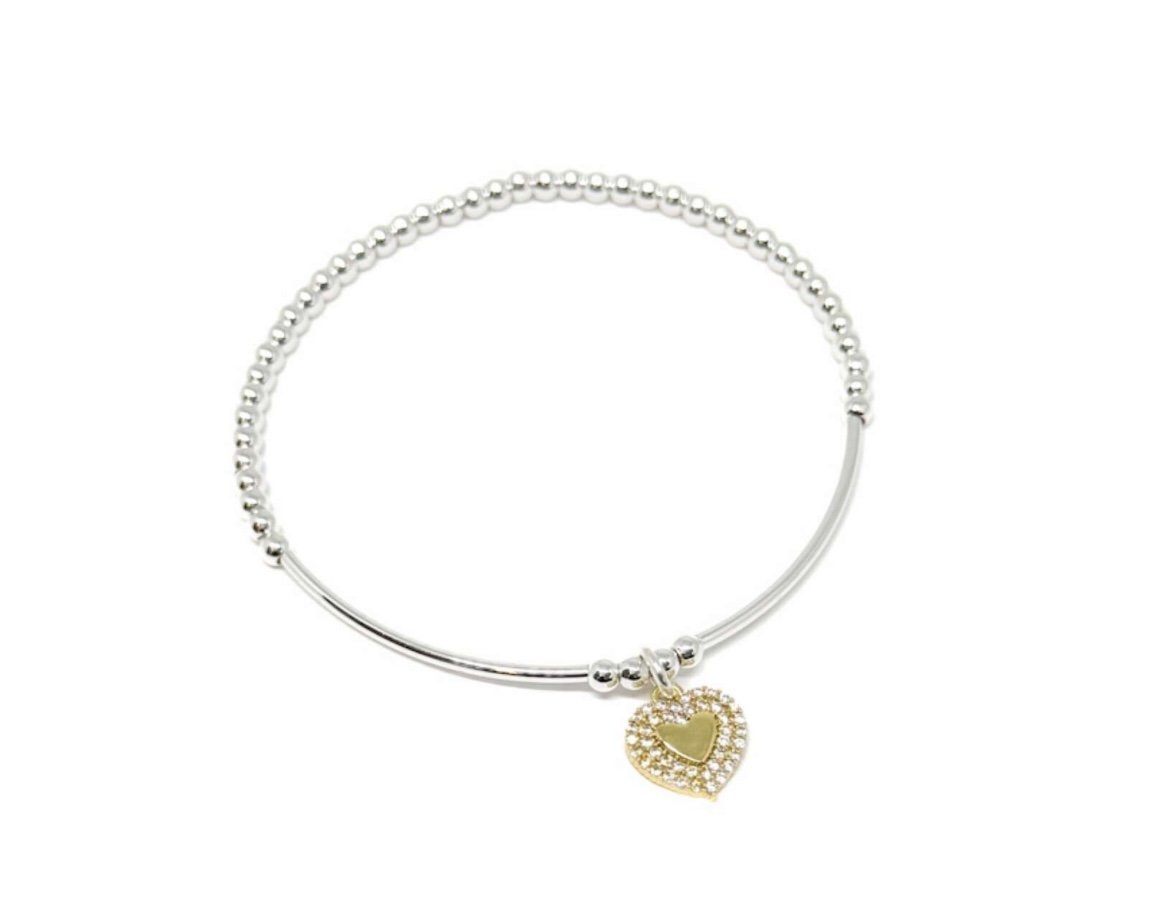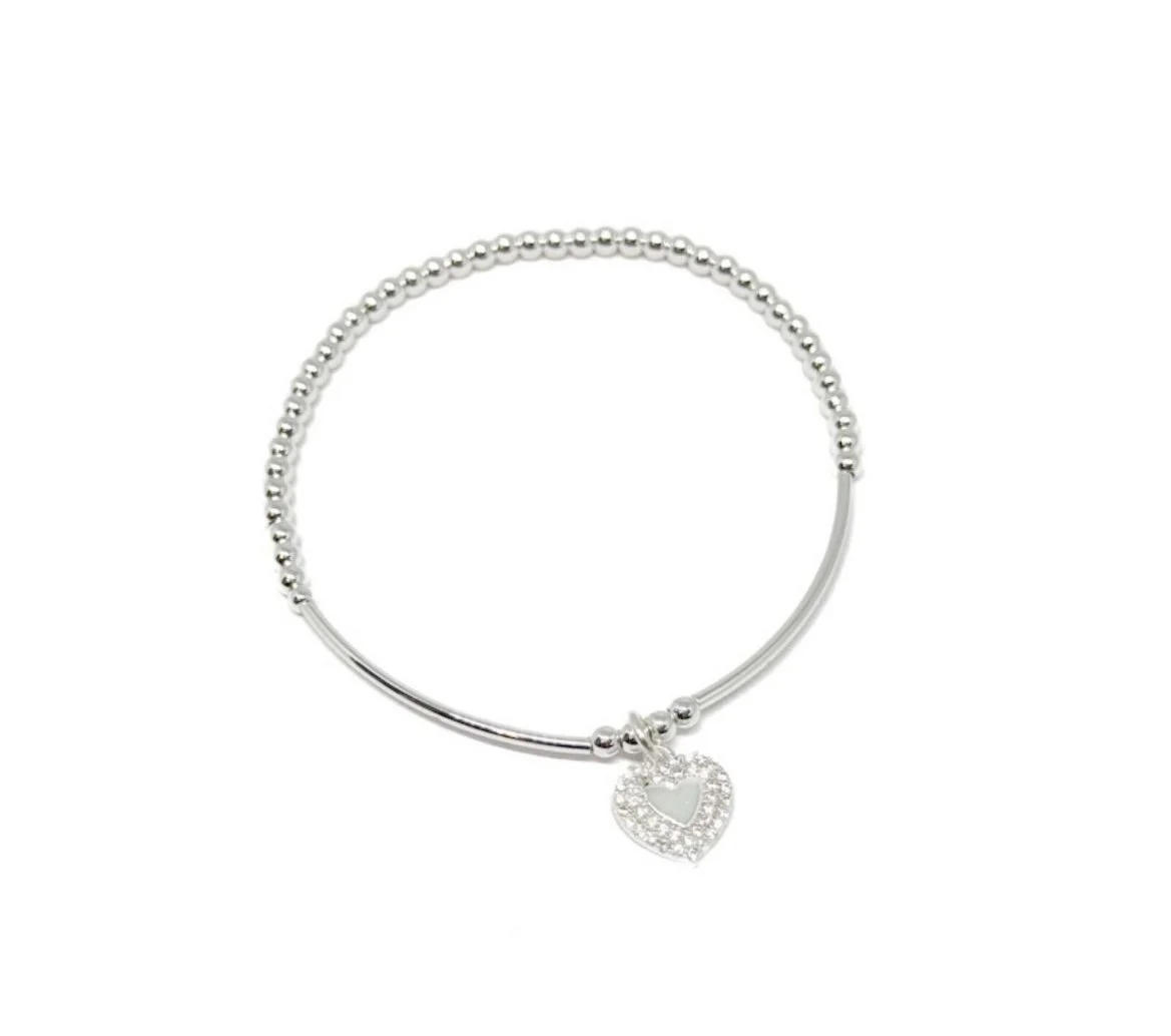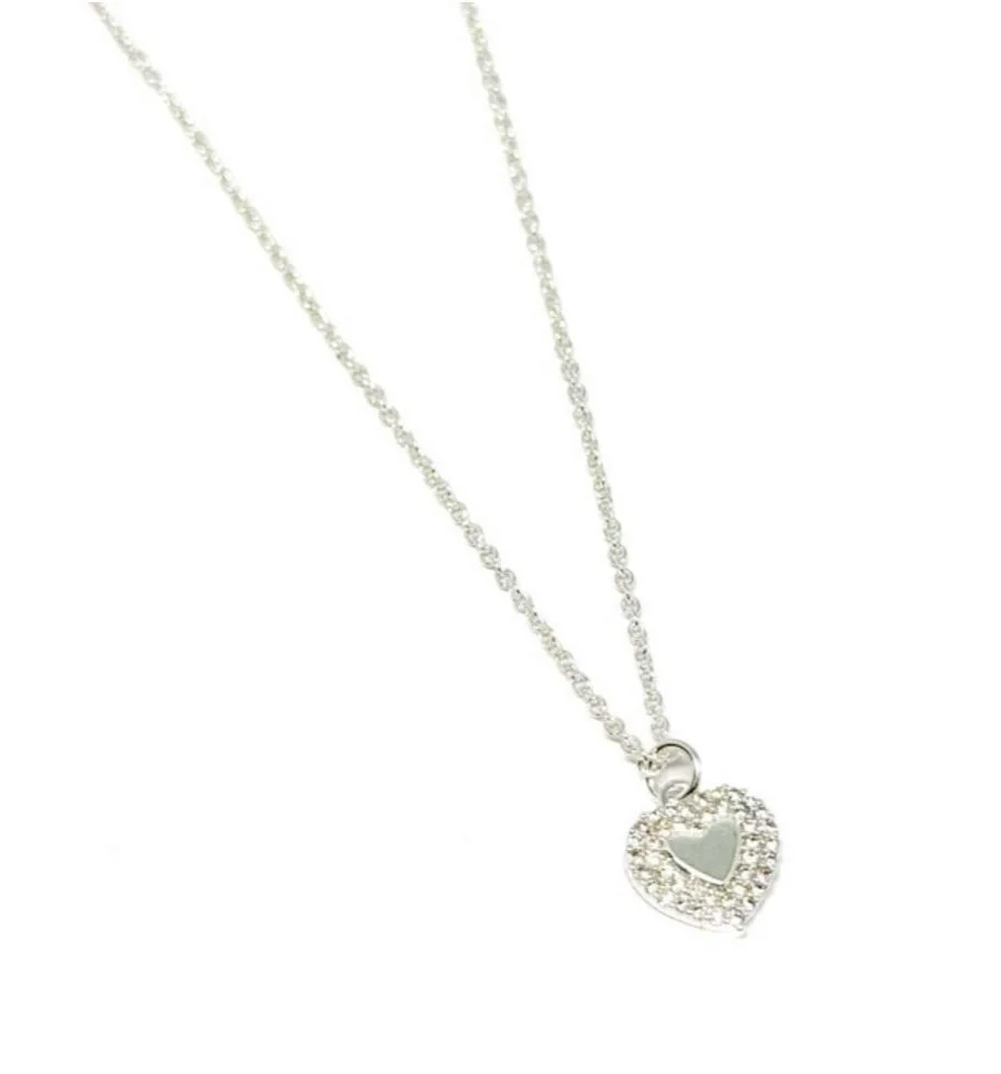 An attractive silver plated heart charm with sparkle detail on a 16” satellite chain with a 2 “ extender chain and a trigger clasp.