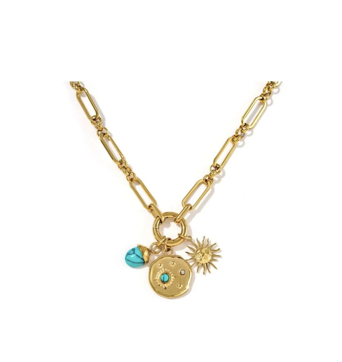 Design- featuring a 46 cm bold oval link chain with three detachable charms- one symbolic eye medallion and two malachite stones.