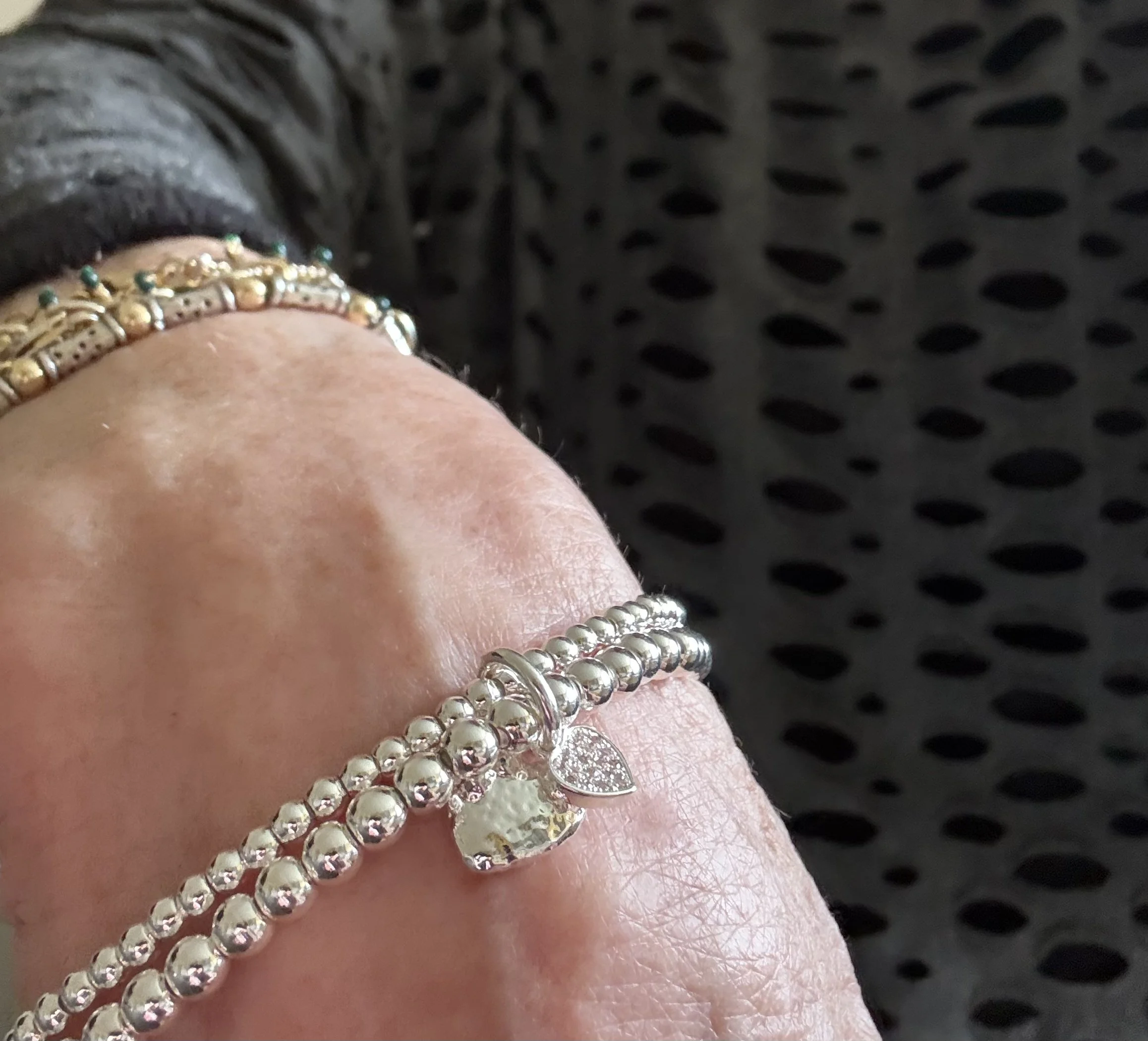 The layering has already been done for you! A variation of the Hannah Hammered Heart Bracelet.. Two silver plated ball bracelets on triple stretch elastic, adorned with a silver or gold hammered heart with accent sparkling heart charm.Matching necklace available.